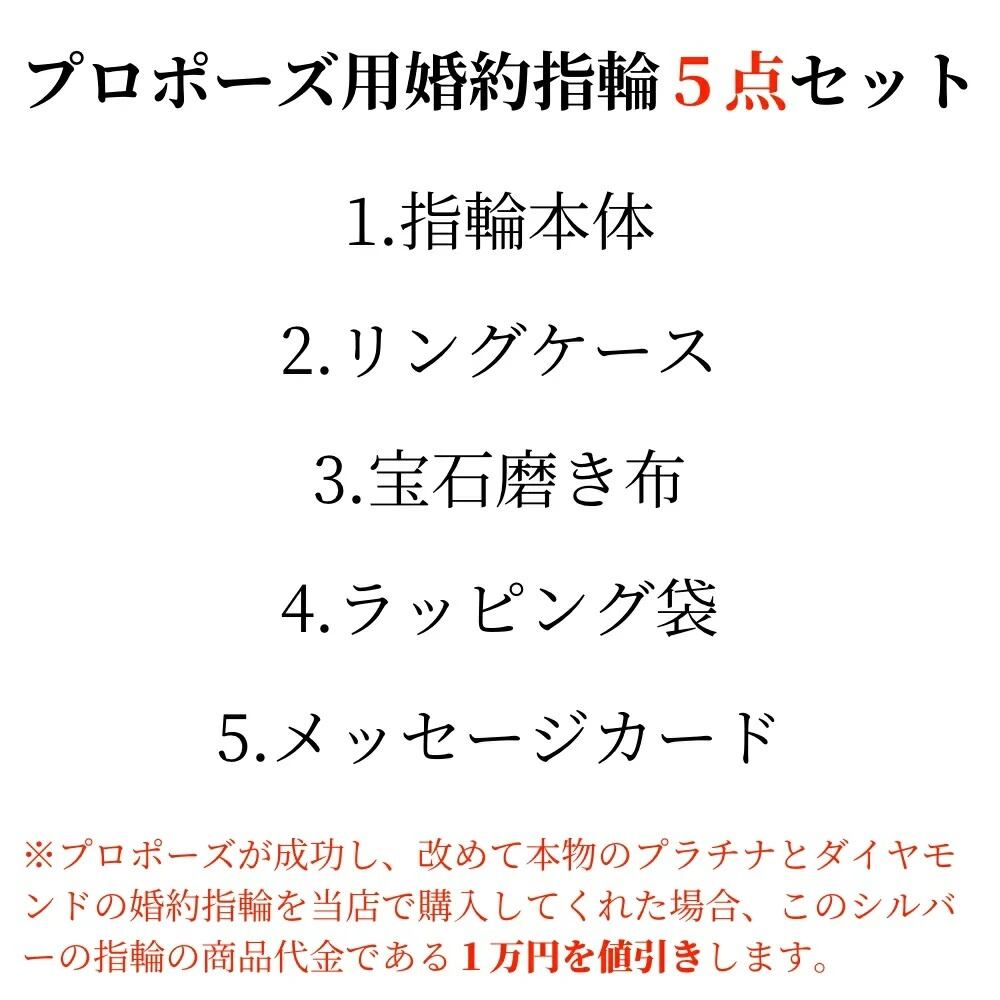 このようにプロポーズをするには最高の指輪だと思いますし、いつでも決行できるように付属品は下記一式となっています。